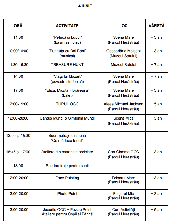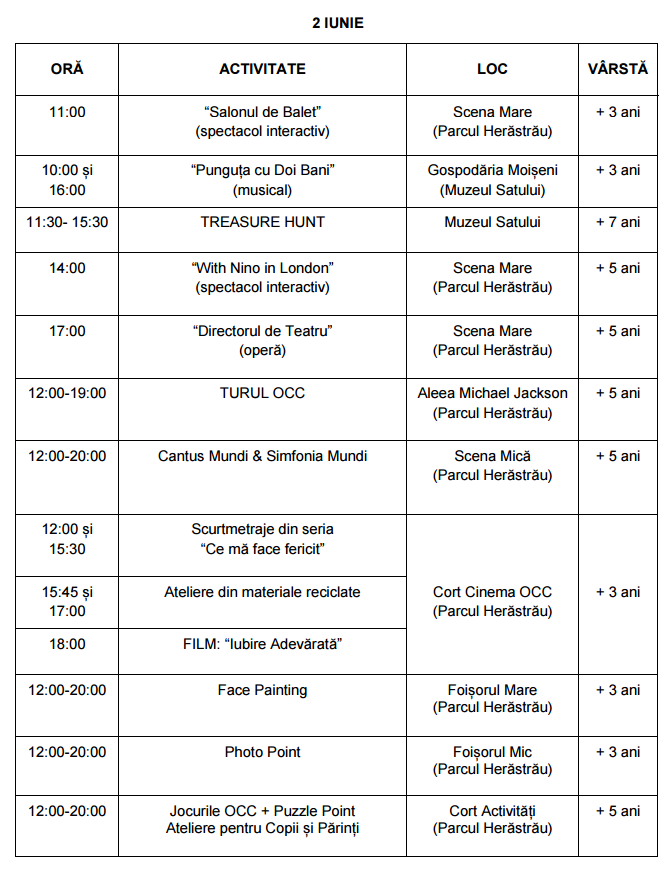 Dragi parinti, in mana voastra sta puterea de a le oferi copiilor vostri o copilarie frumoasa. Sa fii fericit nu inseamna sa ai ultimul tip de smartphone! Sa fii fericit inseamna sa alergi, sa te bucuri de natura, sa te bucuri de activitati impreuna cu parintii! Maine este ziua lor, a celor mai sincere si minunate fiinte din vietile noastre: COPIII! Incepand de maine, 1 iunie si pana pe 4 iunie, Opera Comica pentru copii va ofera posibilitatea de a va duce impreuna cu cei mici la Festivalul Opera Copiilor ce va avea loc in parcul Herastrau si la Muzeul Satului.